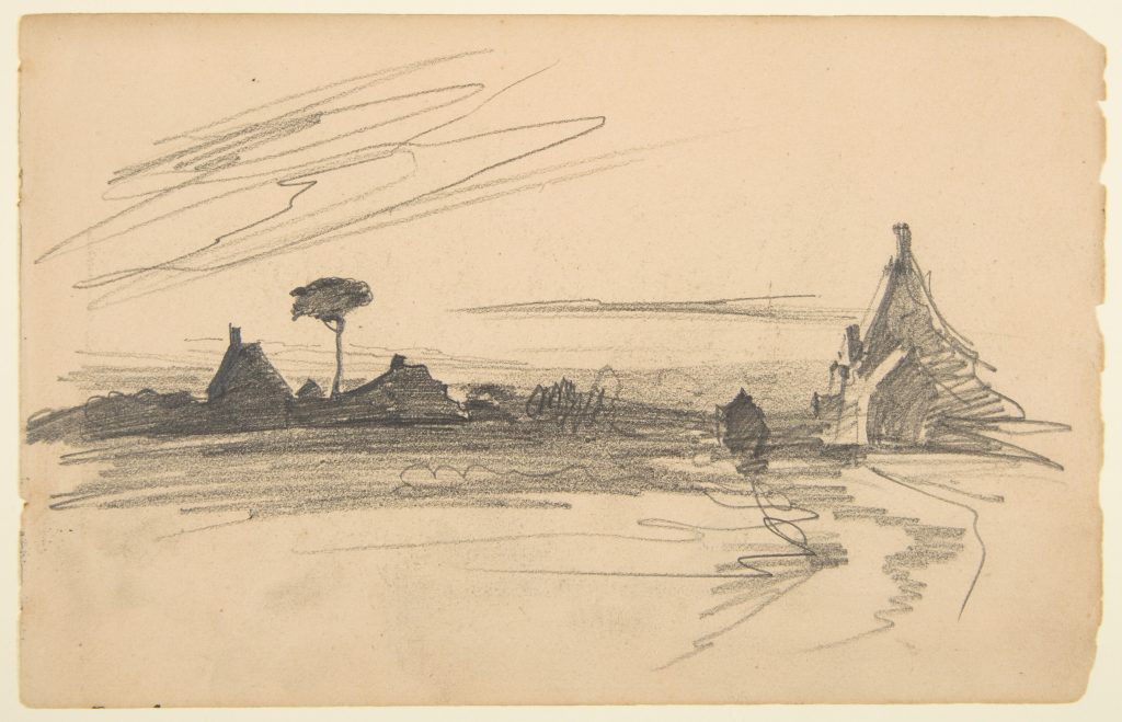 Il est toutefois possible que le caractère assez sommaire de cette aquarelle de Delacroix soit le résultat d’un dessin a posteriori. Selon Marie-Pierre Salé, il était courant pour les artistes de dessiner une scène d’après mémoire afin de se distancer de la surabondance de détails((Ibid., p. 21.)). Delacroix aurait donc peint ce paysage d’après le souvenir qu’il en aurait gardé, ce qui, toujours selon Salé, n’était pas inhabituel pour l’artiste, chez qui on retrouva un dessin annoté « fait le lendemain ((Ibid., p. 21.))». D’ailleurs, Delacroix écrira dans son journal en 1854 que « le paysage qu’il [lui] faut n’est pas le paysage absolument vrai ((Eugène Delacroix, Journal de Eugène Delacroix, Paris, Librairie Plon, 1893, vol. II, 1850-1854, p. 477. Récupéré de < http://www.gutenberg.org/files/54421/54421-h/54421-h.htm >. Consulté le 28 mai 2020.))», car la meilleure façon d’émouvoir le spectateur est de lui présenter « la nature par souvenir » à travers le tableau((Ibid., p. 477.)). L’idée de la peinture d’après mémoire remet en doute la possibilité d’une scène saisie sur nature. Au-delà du souvenir, le carnet nous en apprend aussi énormément sur son auteur, ainsi que le suggère Bouffier. En parlant d’une autre série d’aquarelles effectuée lors d’un voyage de Delacroix à Tours, il explique que les carnets, par la versatilité de leurs usages, nous montrent non seulement les méthodes de travail de l’artiste, mais aussi son processus de création lors de la représentation de la nature((Jacques Olivier Bouffier, « The Tours Sketchbook of Eugène Delacroix », Metropolitan Museum Journal, vol. 29, 1994, p. 139.)). Cette Vue de Delacroix, en plus d’exemplifier les pratiques de l’aquarelle en plein air selon Salé, nous donne accès à l’esprit de l’artiste.