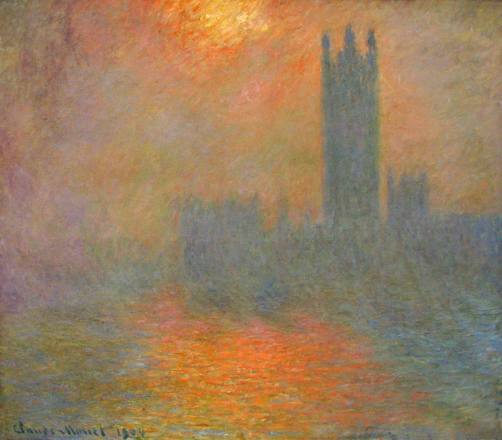 Claude Monet, Londres, le Parlement. Trouée de soleil dans le brouillard, 1904, huile sur toile, 81,5 x 92,5 cm, Musée d’Orsay, Paris ((Musée d’Orsay, «Londres, le Parlement. Trouée de soleil dans le brouillard», Musée d’Orsay, En ligne. <https://www.musee-orsay.fr/fr/collections/catalogue-des-oeuvres/notice.html?no_cache=1&nnumid=1177>. Consulté le 3 juin 2020.))